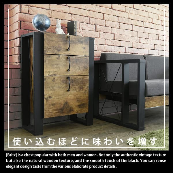■商品説明 カフェの雰囲気を演出できる、ヴィンテージ風シートがおしゃれなブルックリンスタイルのチェスト。