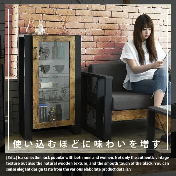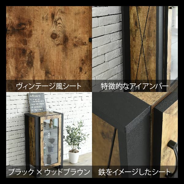 お気に入りの雑貨はここにディスプレイがおすすめ!■本体サイズ[外寸]幅50.5×奥行32.5×高さ90cm■その他サイズ[内寸] (扉内)幅32.5×奥行20.5×高さ76cm (脚間)幅38×高さ10cm (可動棚)幅34×奥行26×厚み0.5cm(3.2cmピッチ13穴)■材質[本体]プリント紙化粧繊維板 [脚]合成樹脂化粧パーティクルボード(PVC) [可動棚]強化ガラス [扉]生ガラス■収納量・耐荷重[天板]約10kg以下 [可動棚]約5kg以下/枚■備考・可動棚:4枚 ・背面化粧有り■生産国中国■組立時間(目安)(大人2人)お客様組立(40分)■キーワードリビング キャビネット ガラス扉 ラック 棚 サイドキャビネット 収納 キャビネット ガラス ユニット オープンキャビネット キャビネットラック ガラス 木製 おしゃれ インテリア インダストリアル スチール アイアン 鉄フレーム ヴィンテージ カフェ カフェ風 塩系 男前 インテリア アンティーク レトロ シャビー シック ニューヨーク 西海岸 ミッドセンチュリー トレンド 家具 ブラウン 木目メーカー希望小売価格はメーカーカタログに基づいて掲載しています